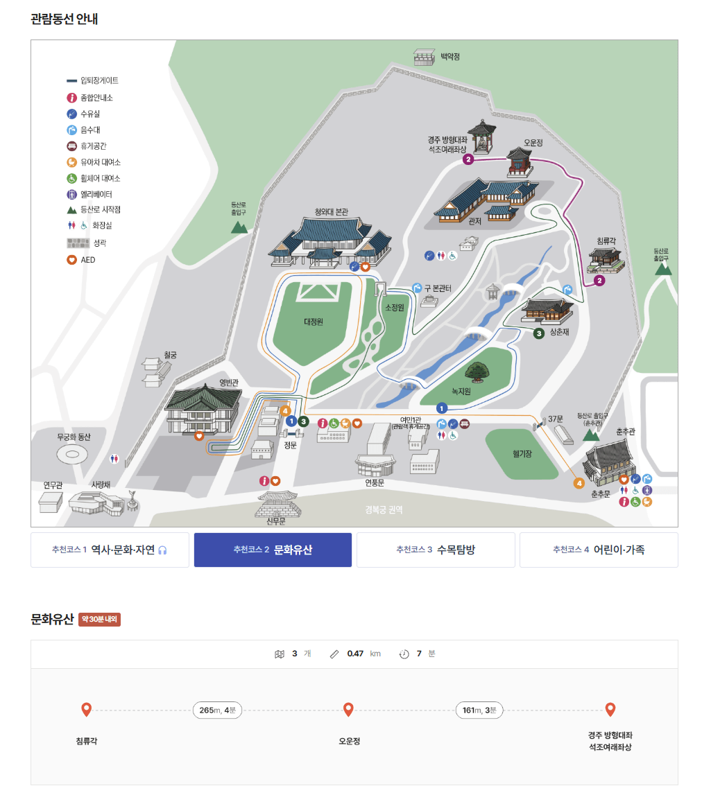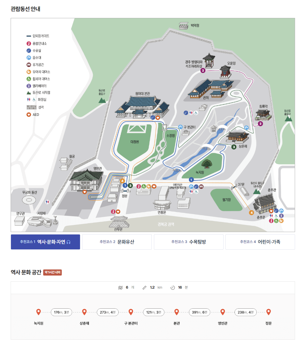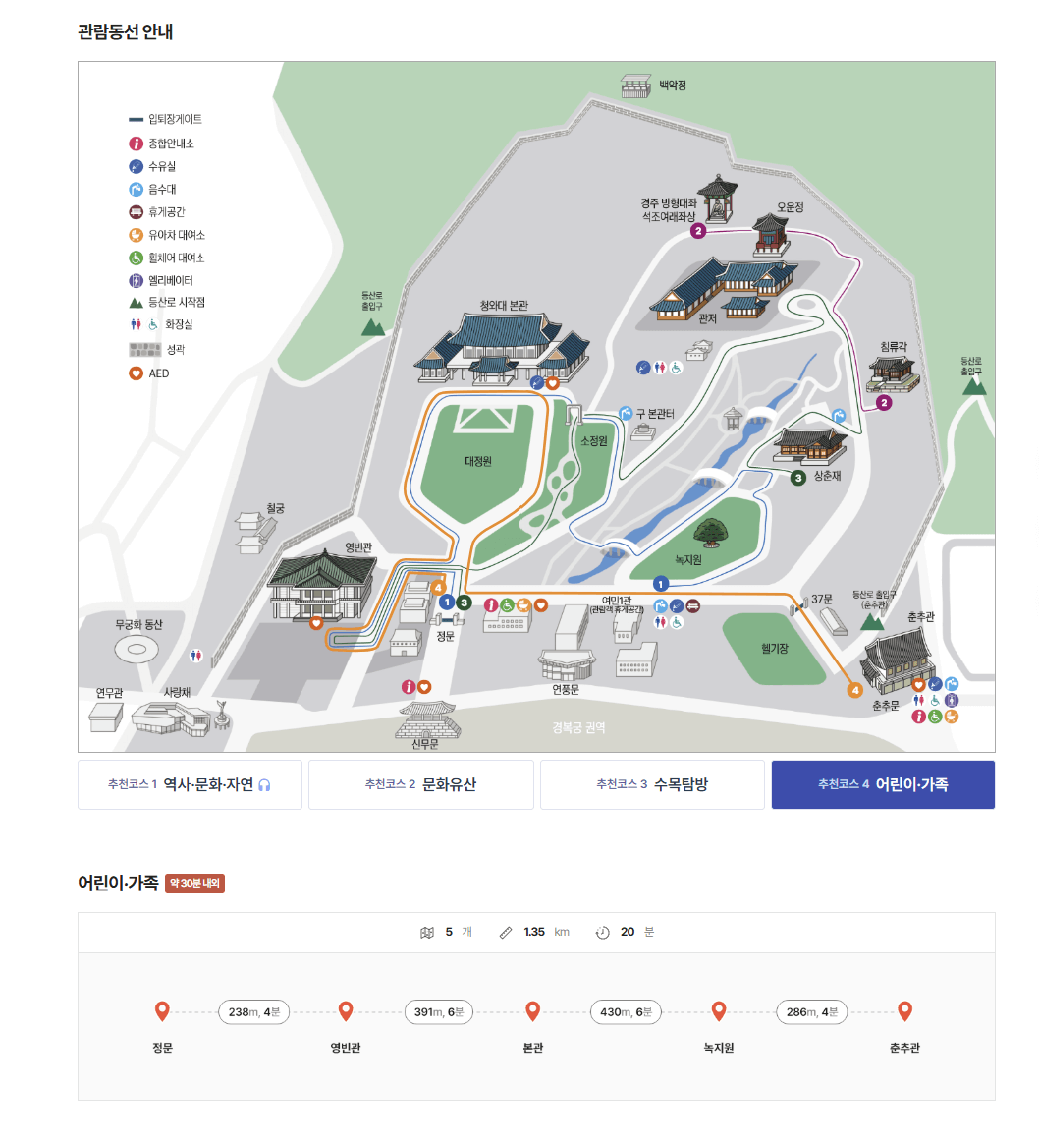- 관람 동선은 본관 → 영빈관 → 춘추관 → 녹지원 → 상춘재 → 관저 → 대정원 순으로 돌면 효율적.
