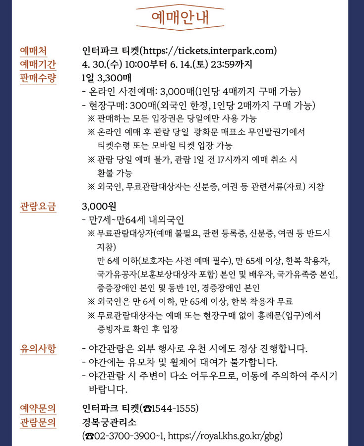 - 관람 인원: 1일 3,300명 (온라인 예매 3,000명, 외국인 현장구매 300명)