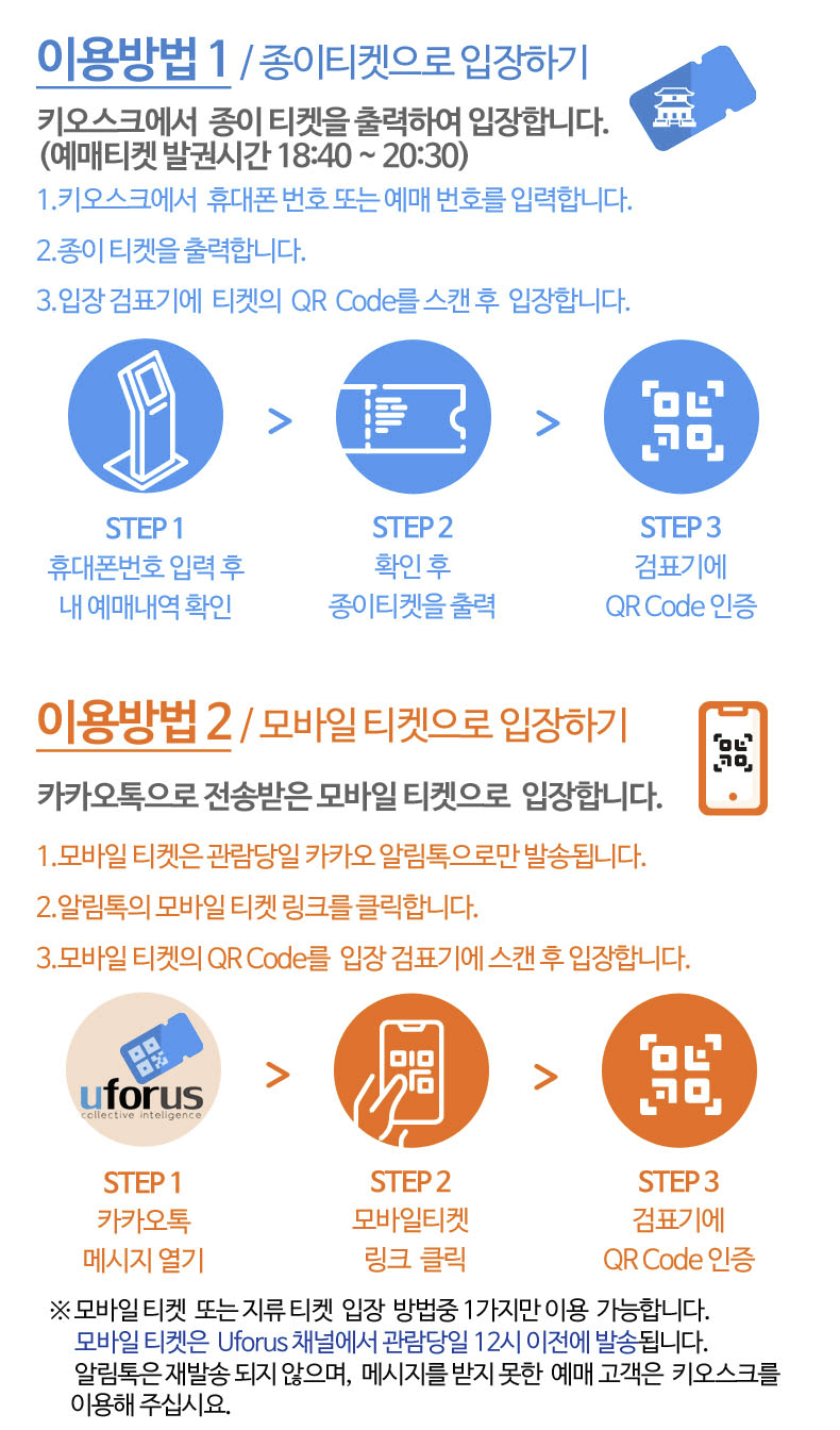 - 관람 당일: 모바일 티켓 또는 무인발권기에서 티켓 수령 후 입장