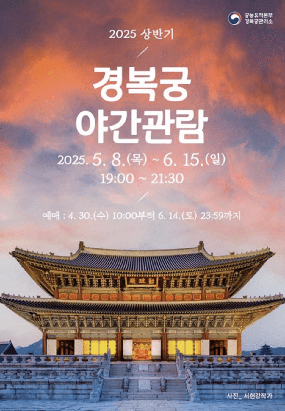 2025년 상반기 경복궁 야간관람 예매 오픈! 2025년 4월 30일(수) 오전 10시부터 인터파크 티켓에서 선착순 예매 시작!