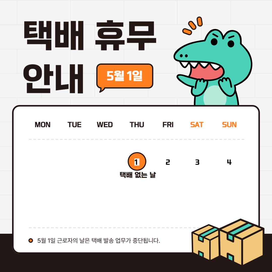 2025년 근로자의 날 택배, 5월 1일엔 배송·접수 모두 중단! 긴급 배송은 미리 접수하고, 배송 지연에 대비해 여유 있게 주문하세요.