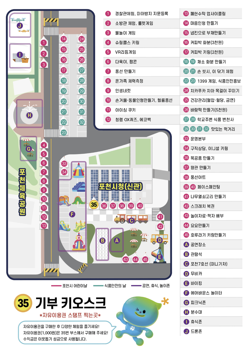 - 자유이용권은 행사장 입구에서 구매(1,000원) – 놀이기구, 체험부스 모두 이용 가능