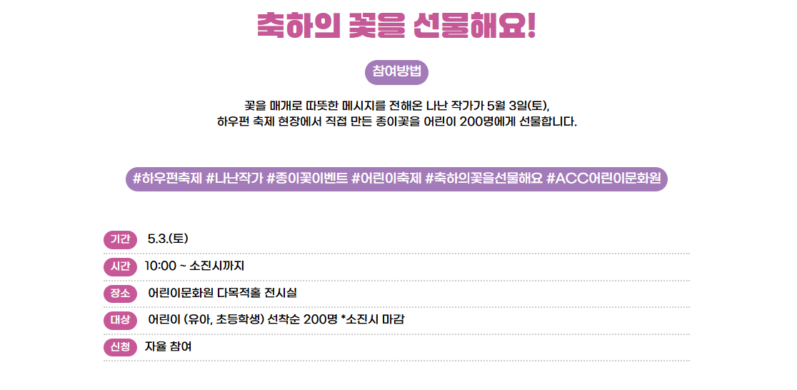 - ACC 어린이 그림그리기 대회: 5월 3일, 유치부·초등부 400명 대상, 온라인 사전 및 현장 접수
