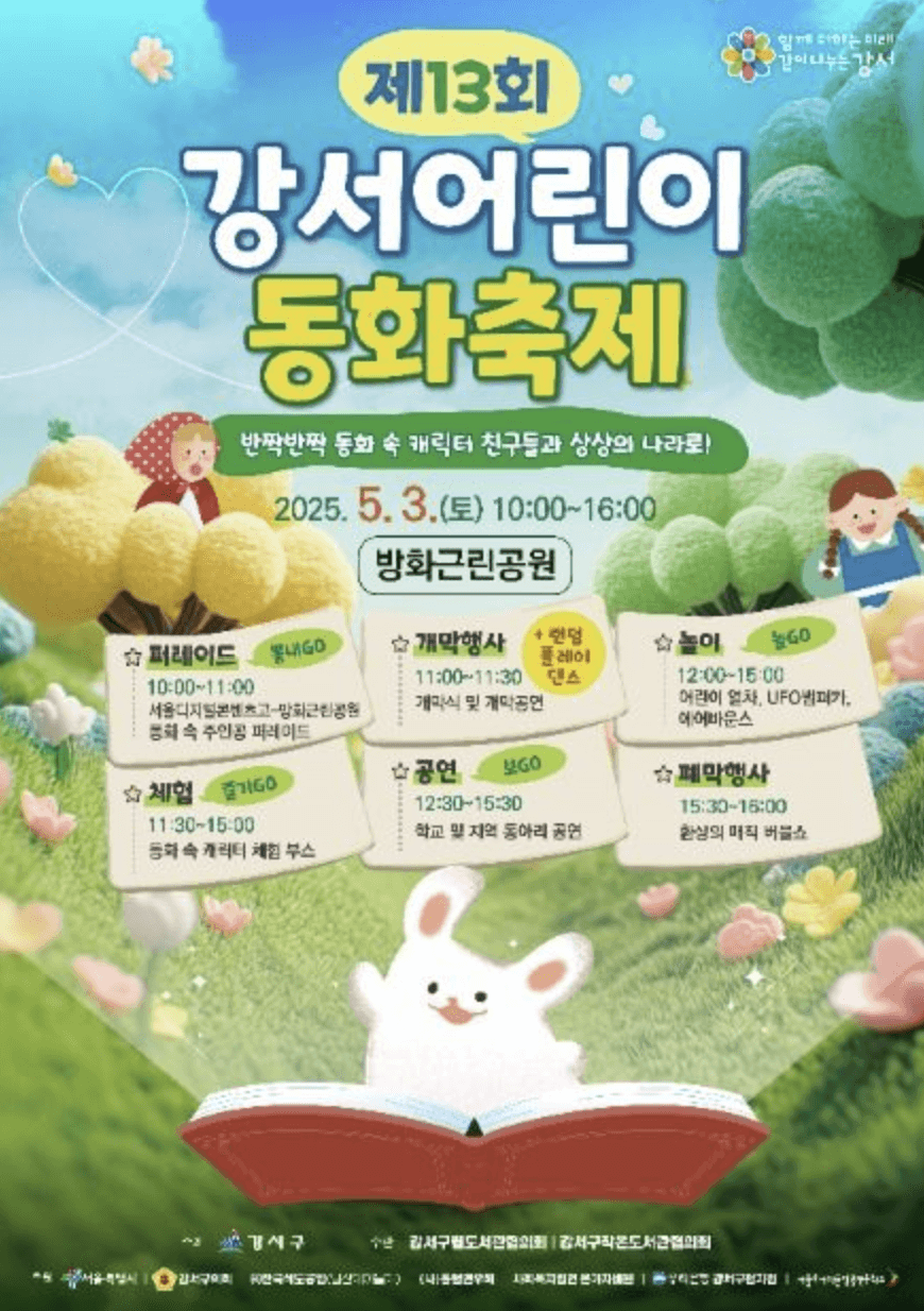 동화 속 캐릭터 퍼레이드, 다채로운 체험, 공연, 놀이기구, 먹거리까지 모두 즐길 수 있는 강서구 대표 어린이날 축제! 2025 서울 어린이날 행사 강서 어린이 동화축제의 일정, 프로그램, 꿀팁, 위치, 교통, 추천 포인트까지 꼼꼼하게 안내합니다.